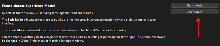 Click on Expert Mode on the main VirtualBox window to ensure you have access to all the settings needed for the labs: